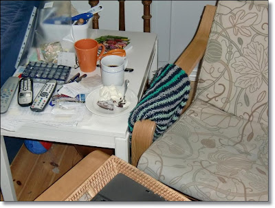 Här är det också en hel del som man vill ha nära sig: mer fröer, olika fjärrkontroller, telefon, medicin och Millas saker bl.a borste. Sen måste man ju ha kaffekoppen och en god kladdkaka med liiite grädde... ( oj, ser nu att det var mycket grädde..hihi).